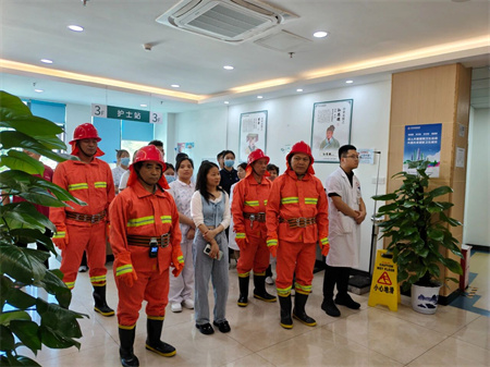 随后,与会的工作人员在教官的指导下,开展了火灾逃生演练。随着紧急警报响起,总指挥接到火情报告后第一时间赶到现场,立即启动消防安全应急预案,各应急救援小组迅速集结,在统一指挥下按职责分工迅速展开疏散、灭火和应急救援等行动,指导住院患者和家属通过消防通道有序撤离至院内安全区域,医护人员按消防预案的疏散线路,捂住口鼻,弯腰快跑,沿着墙壁迅速撤离,高效完成消防应急疏散工作。